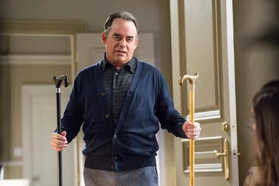 Wanting his "sudden recovery" to be miraculous but believable, Adrian asks Carmen which cane he should use down at the club; she points out that his gold one makes him look like a pimp, and he that's the one he decides to go with, before pointing out that Carmen is letting Daniela get away with murder by doing all her chores for her and not reprimanding her for her reckless behavior. Meanwhile, he cuts off Evelyn's funding and hides all his money in offshore accounts, meaning her credit card is declined when she attempts to stay at a hotel. When she returns to her home to talk to him about it, he has Carmen refuse to let her in, believing that if he makes her miserable and broke then eventually she'll be forced to call crawling back to him. He believes it to be romantic. Evelyn vows that the next time she speaks to Adrian will be through an attorney but, when she goes to meet with one who is interested in taking her case, he suddenly has to drop her as a client due to a conflict of interest; it seems that Adrian has hired out all the divorce attorneys in Beverly Hills, trying to make it so that her only option for money is to reconcile with him, to her pure horror. She goes to meet with him at the club to try and persuade him to stop this madness, only for him to frighten her by painting her a picture of her life without him: she is poor with no maid and has to buy generic brands from a supermarket; she also now eats peanut butter, owns a change purse, doesn't throw pennies away and collects coupons. Evelyn can't take it, to Adrian's delight, and he points out that she can easily put a stop to all of it, though she refuses to get back together with him. Instead, she decides to take Marisol up on her earlier offer and stay with her. ("War and Grease")