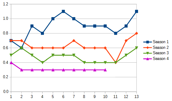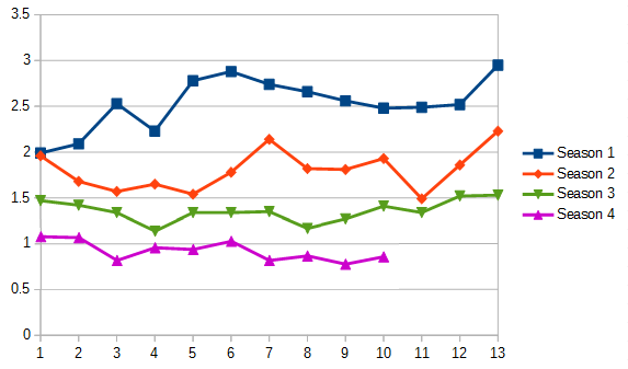 | Season 4 | 1.08 | 1.07 | 0.82 | 0.96 | 0.94 | 1.03 | 0.82 | 0.87 | 0.78 | 0.86 | - | - | - |