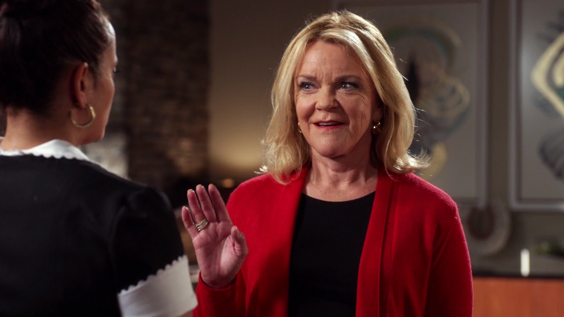 Zoila shows up looking for Kyle only to learn from Frances that he's gone out of town on family business and won't be back for some time; instead, Frances takes Zoila out to lunch with her, and the latter starts to enjoy the perks of being within her new boyfriend's mother's inner-circle, with Frances still having no idea that Zoila is only pretending to be rich. Later, Frances tells Zoila that she's heard whispers from her friends about how Zoila's accepted multiple invitations to various social gatherings without extending any of her own. As such, Frances ran some damage control and told everyone that Zoila's hosting a cocktail party on Friday, to Zoila's horror. She doesn't think she has to resources to pull of hosting a party in two days' time, but Frances points out that her maid can simply do all the work, to Zoila's further horror. Zoila has her friend Carmen and her daughter Daniela work the party which Frances thinks is a huge hit, though things soon go downhill when Daniela spills all over Frances' very expensive silk blouse, leading Zoila to have to "fire" both her maids in front of everyone when they refuse to apologize. Frances expresses her sympathies for her new friend, saying that she understands how hard it is to find good help. ("War and Grease")