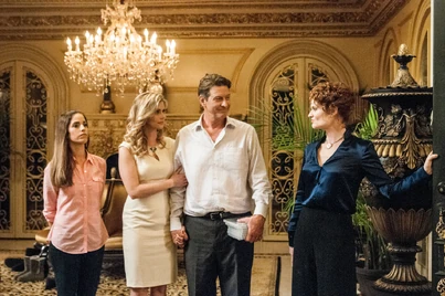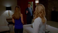 Taylor is pregnant and can't wait to share the news with absolutely everyone she knows, but Michael is worried about word getting out because of how Olivia might react. To avoid her having to find out the hard way, Michael pays his ex-wife a visit and amicably breaks the news that he's successfully starting a family with Taylor, to her dismay. Marisol, meanwhile, convinces her beautiful blonde employer to have a dinner party to announce the pregnancy officially, having an agenda that involves talking to her son's old catering colleague about something to do with Flora's murder. Taylor is at first hesitant by the amount of guests who end up arriving, but everything turns out for the best and the Stappords are able to joyously announce the good news to all their friends. The festivities are cut short however when Marisol spots something horrifying outside... Olivia Rice is hanging by the neck from a tree, attempting suicide due to Taylor's pregnancy. Everyone is shocked and Michael quickly works to have her cut down, crying over the possibility of his former spouse's death. Taylor is deeply saddened to see how much he obviously still cares for her. ("Hanging the Drapes")